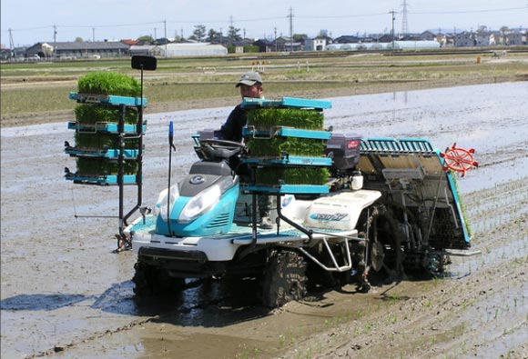 ●田植え作業は、機械にて 田植え、施肥、除草剤散布といくつかの行程を1台の田植機で行います。